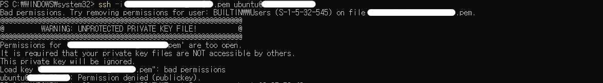 Permissions for '*.pem' are too open. ssh 접속 시 키 파일이 공개적이면 이런 에러가 발생한다. 권한 설정을 해주면 된다. 해당 키 파일을 우클릭 속성 ➡️ 보안 탭 ➡️ 고급 3. '상속 사용 안 함'에서 '이 개체에서 상속된 사용 권한을 모두 제거합니다 '를 선택한다. 4. '추가' 버튼을 클릭한다. 5. '보안 주체 선택'을 클릭한다. 6. '고급'을 선택한다. 7. 내 계정을 찾아서 추가한다. 8. 권한 설정을 해준다. DevOps/AWS 2023.12.03
