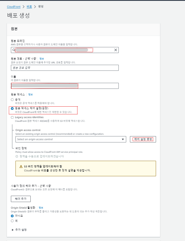 AWS CloudFront CloudFront Cache Server 전 세계 어디든지 빠르게 컨텐츠를 제공할 수 있는 CDN 🟡 CloudFront 생성 CloudFront와 S3를 연동해서 정적 리소스 파일 서빙용으로 사용할 것이다. 생성된 S3가 있다는 가정하에 CloudFront를 생성해보겠다. 추후에 https 적용 및 Route53 도메인 연결을 하면 좋을 것 같다 ! 원본 도메인에서 S3를 선택한다. 이름은 원본 도메인을 선택하면 자동으로 할당되길래 이걸로 사용했다. OAI 설정은 CloudFront를 통해서만 S3에 접속할 수 있도록 한다. 나는 AWS에서 권장한대로 CloudFront를 생성한 후 직접 버킷 정책을 수정하는 원본 엑세스 제어 설정(권장) 옵션을 선택했다. Legacy access Identities.. DevOps/AWS 2023.11.29