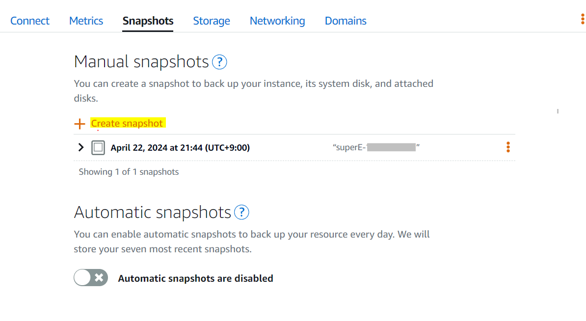 [AWS] Snapshot을 이용해서 복구하기 1. Snapshots 생성Snapshot을 생성하는데 시간이 좀 걸린다.2. Snapshot을 이용해서 새로운 인스턴스를 생성기존 인스턴스는 직접 삭제해야 함 3. 인스턴스를 생성할 때 방화벽을 해제하는 스크립트 추가 4. SSH 접속을 한 뒤 방화벽 활성화sudo ufw allow 22sudo ufw enable 🍍 Snapshot 사용 비용청구서를 보면 알다시피 무료가 아니니까 참고하기~ DevOps/AWS 2024.04.22