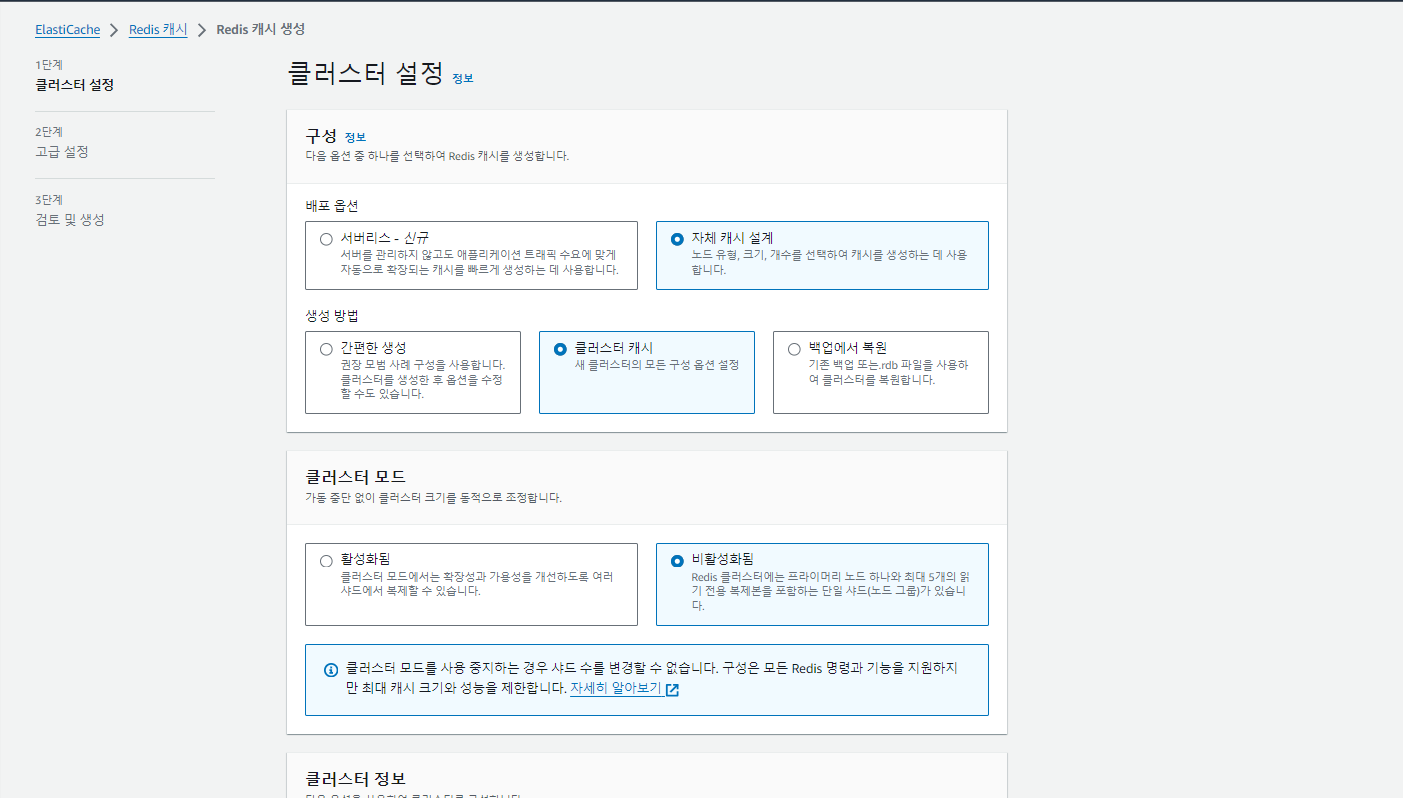 AWS ElastiCache 프리티어 생성 2024년 1월 28일을 기준으로 작성됨 ElastiCache를 프리티어로 생성해보았다. 1. 클러스터 설정 ElastiCache Serverless는 프리티어에서 사용할 수 없다. 클러스터를 직접 설계할 때는 노드 시간당 요금이 책정된다. 캐시 노드 유형 vCPU 메모리 네트워크 성능 시간당 요금 cache.t3.micro 2 0.5GiB 최대 5기가비트 USD 0.025 cache.t2.micro 1 0.555 GiB 낮음에서 중간 USD 0.026 ElastiCache cache.t2.micro 또는 cache.t3.micro가 프리티어에서 사용할 수 있다. 위 표를 참고해서 선택하면 된다~ 2. 고급 설정 백업은 월별 GB당 0.085 USD만큼 요금이 부과된다. 3. 검토 및 생성 참고 👇👇👇 .. DevOps/AWS 2024.01.28